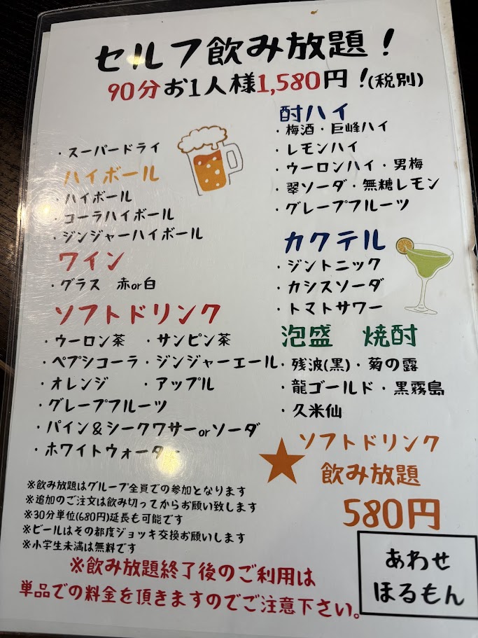 僕はノンアル一杯とジュースとかの飲み放題580円。妻はアルコールの飲み放題1580円を飲む