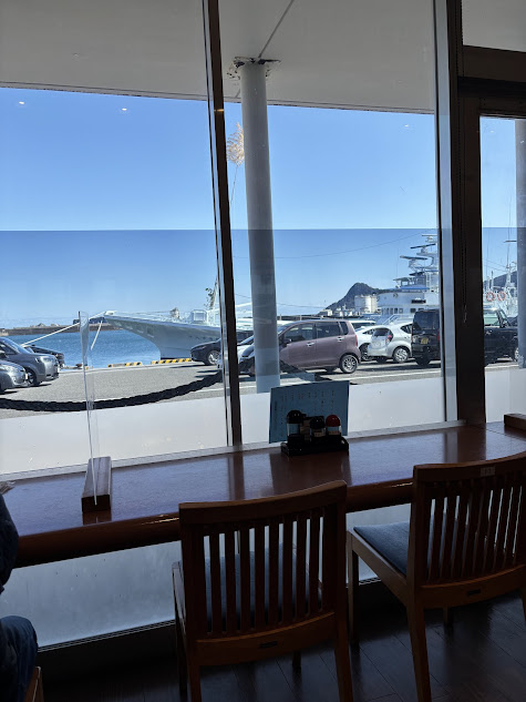 ものすごくお客さんが多くて賑わっていました。窓からは最高の天気と海が見えます。