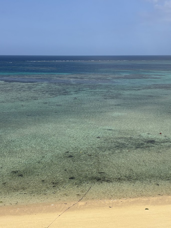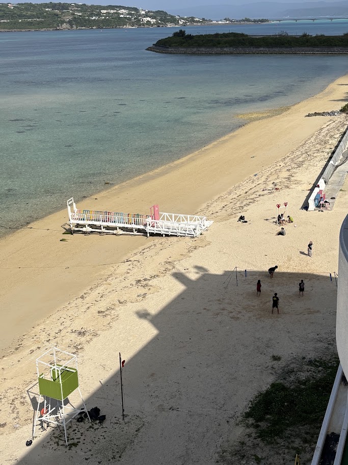 いくつか、問題はありましたが、部屋からの眺めがとにかく素晴らしい! 右手に目を向けると、先ほど行ってきた「古宇利大橋」が見えます。あちらは入場料(通行料)が必要な場所もありましたが、ここでは無料。そして、ここからの眺めも負けず劣らず、海の透明度が抜群。 夏場は目の前が海水浴場になるそうなので、シーズン中なら多くの人で活気づくのでしょうね。